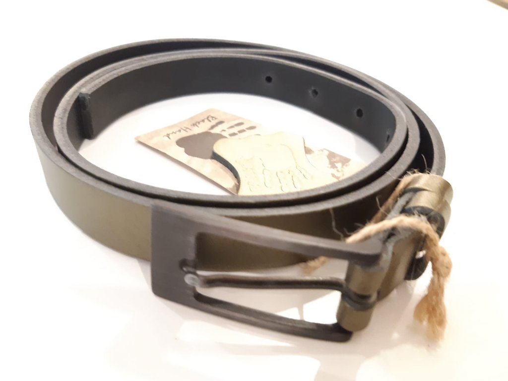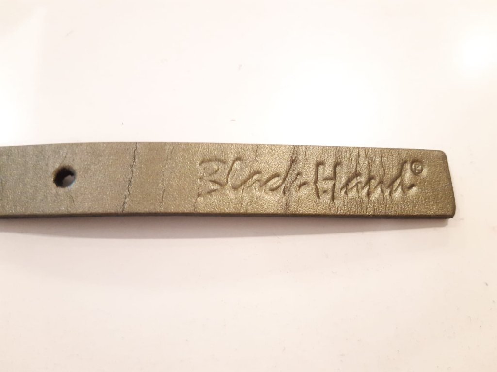 Detaily: kovová spona s patinou, kůže je zpracovaná v matném vzhledu, na okraji pásku je vyražené logo BLACK HAND