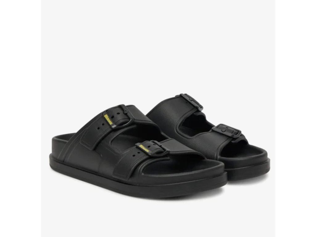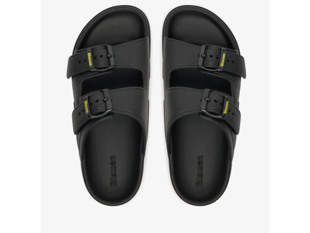 Detaily: černé pantofle BLAUER, regulace na nártu řemínkem, na kterém je žluté logo BLAUER, výška platformy je 4 cm, pantofle jsou velmi lehké a pohodlné