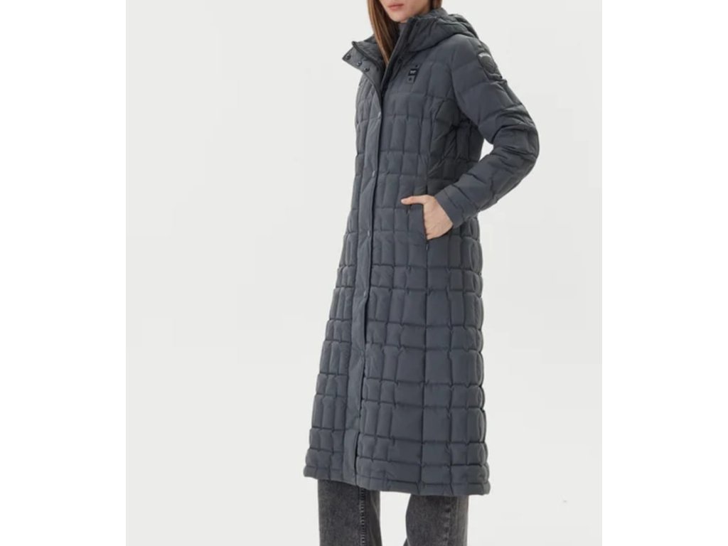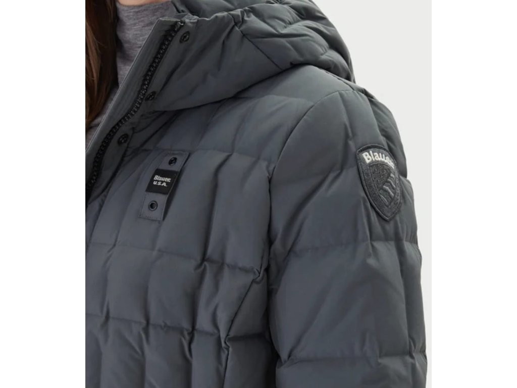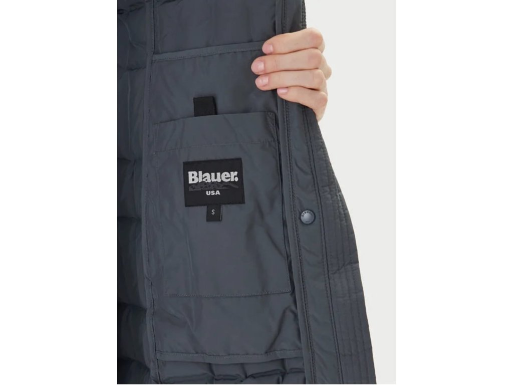 Detaily: maxi kabát má kapuci, která nelze odepnout, designový vzor vrchní látky, vnitřní kapsy na suchý zip, dvě vnější kapsy se zapínáním na zip, centrální zapínání na dvoucestný zip, bílé logo BLAUER na levém rukávu, na levé straně hrudi je bílé logo BLAUER U.S.A., velmi příjemný a lehký materiál