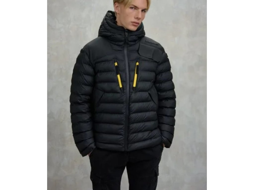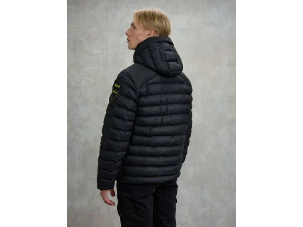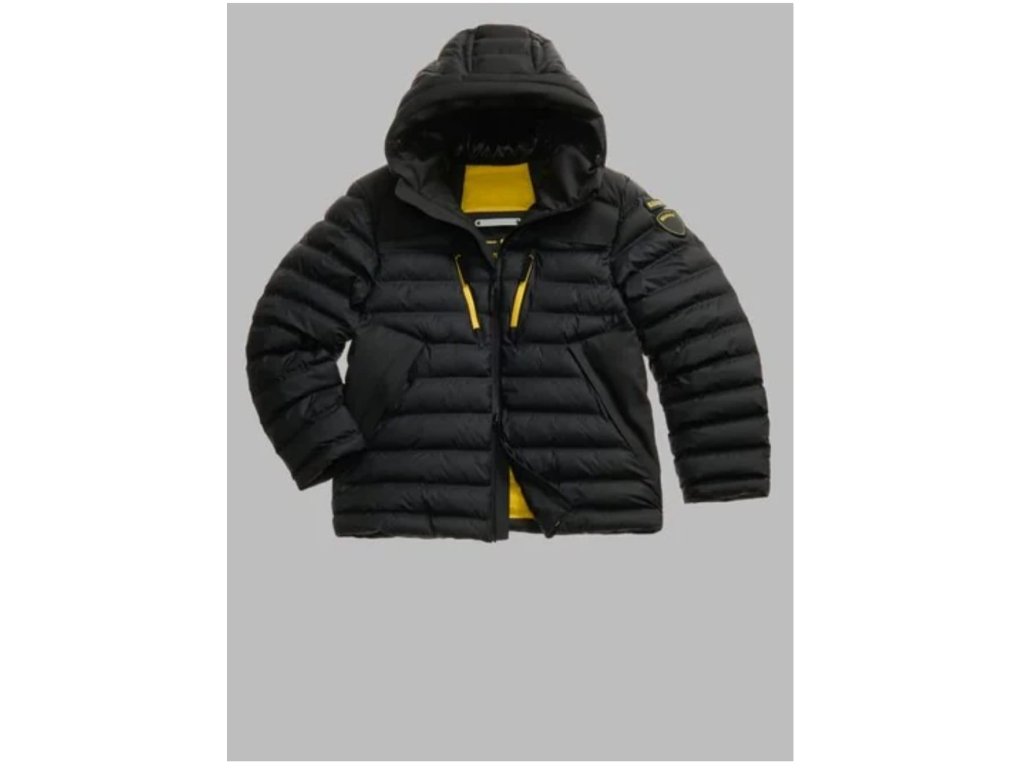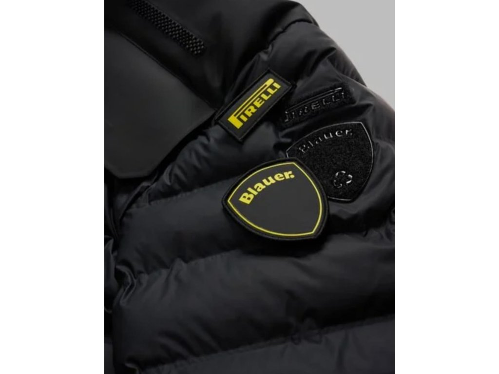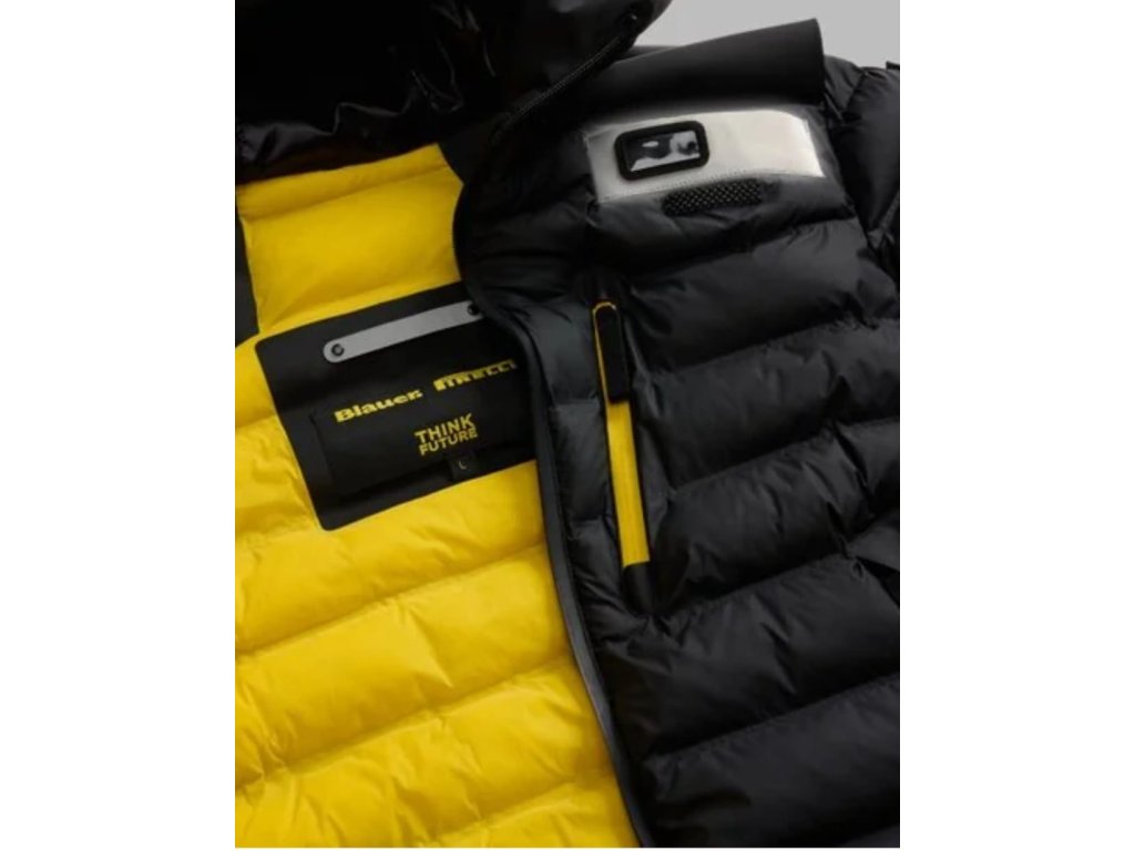 Detaily: pánská černá bunda s kapucí, která není odepínací, stahovací šňůrka na spodním okraji, centrální zapínání s dvoucestným zipem, dvě kapsy vpředu se zapínáním na zip, na levém rukávu je žluté logo BLAUER a nápis PIRELLI, podšívka z hladkého nylonu a vnitřní kapsa na zip, na levé straně hrudi designová kapsa, na prsou jsou dvě kapsy se zapínáním na žlutý zip, velmi příjemný a teplý materiál