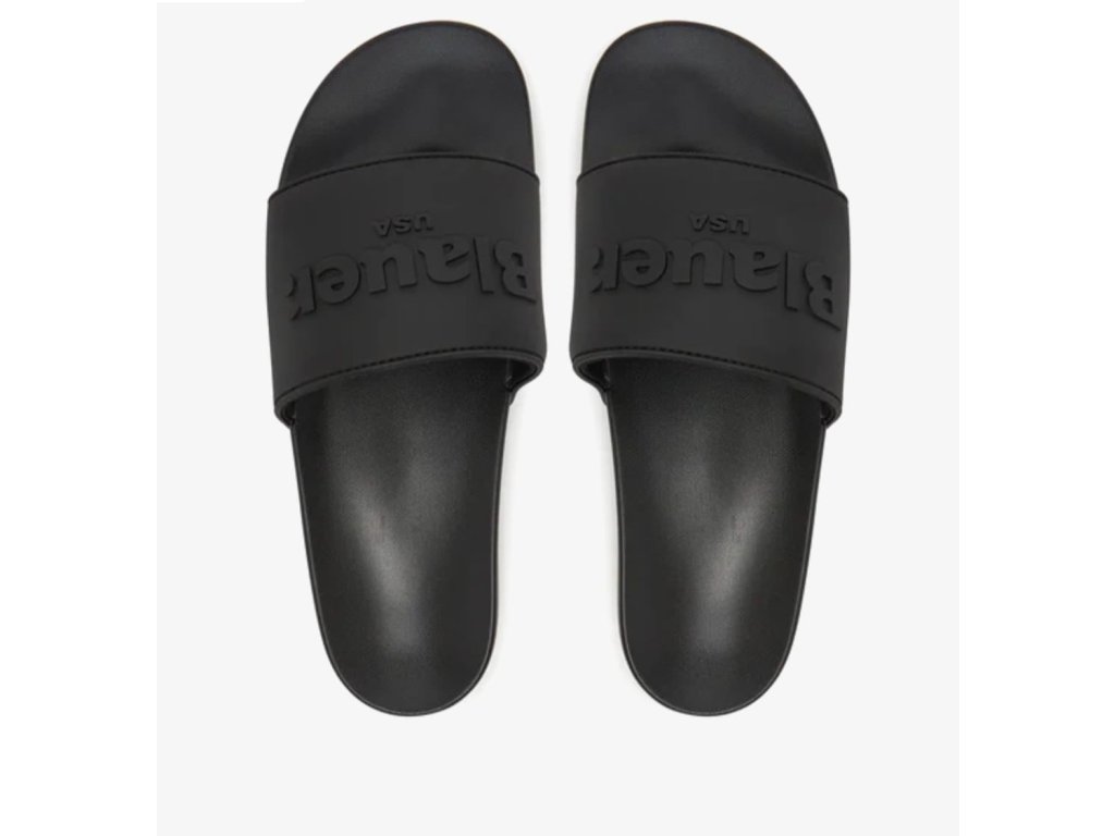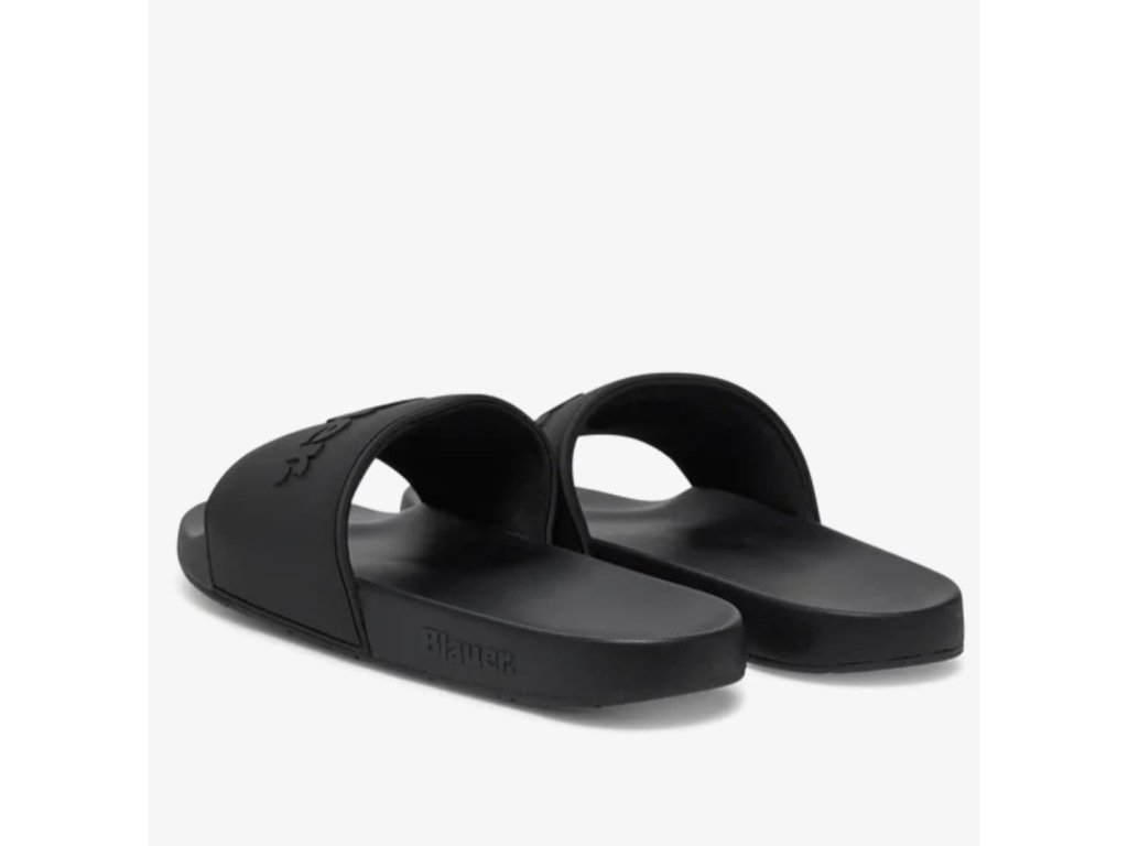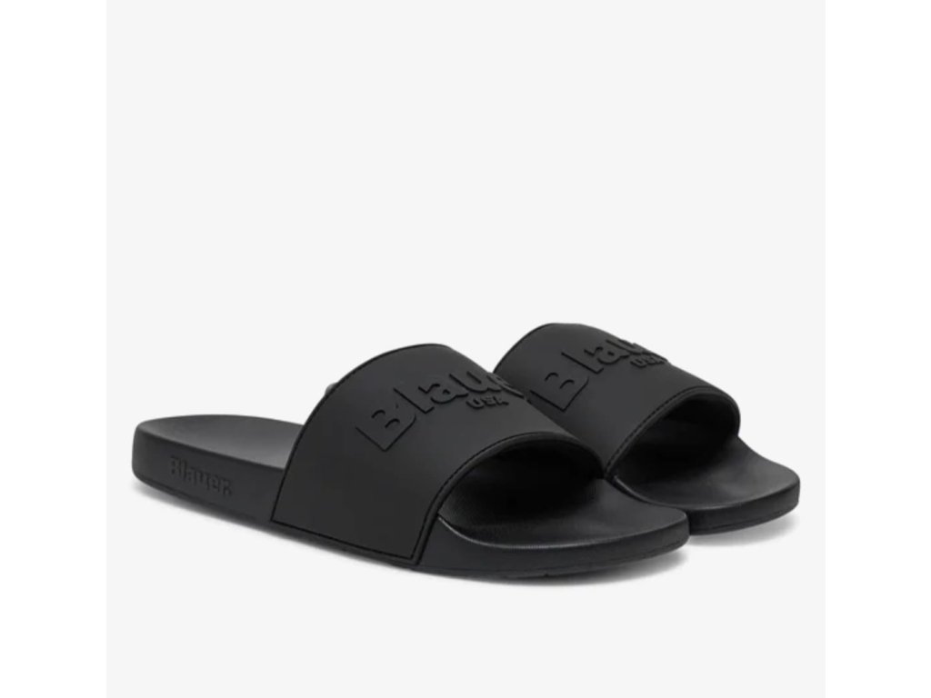 Detaily: černé pantofle BLAUER, vrchní páska je v designovém, černém provedení s černým logem BLAUER, pantofle jsou velmi lehké a pohodlné