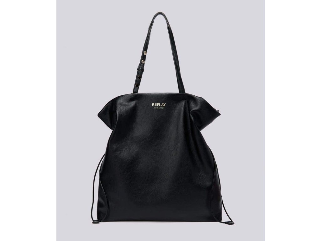 Detaily: dámská kabelka je vyrobena z eko kůže, hlavní kapsa je uzavíratelná na zlatý zip, na přední straně je zlaté logo REPLAY, kabelka má dvě uši šíře je 2,5 cm, dlouhé 63 cm, které mají regulaci ze zlatých cvoků, uvnitř je jedna kapsa na zip a jedna malá se zlatým logem REPLAY, na levém boku je další kapsa se zapínáním na zlatý zip s vyraženým logem REPLAY, po stranách je designová regulace na stažení černými šňůrkami, zakončenými černým labelem c se zlatým logem REPLAY a se zlatými patenty