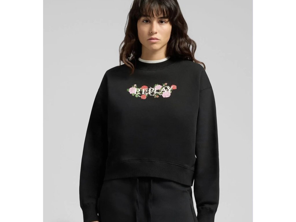 Detaily: klasická mikina přes hlavu, na hrudi je bílé, designové logo REPLAY s květy, spodní okraj a konec rukávů má náplety, velmi příjemný materiál
