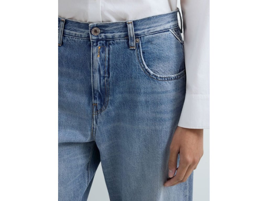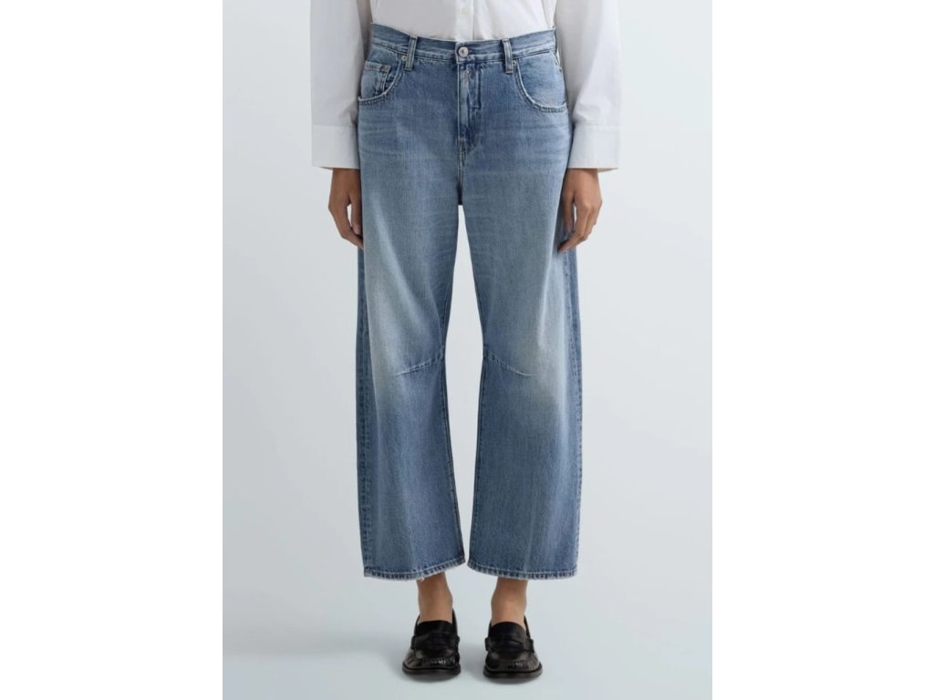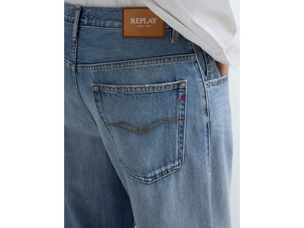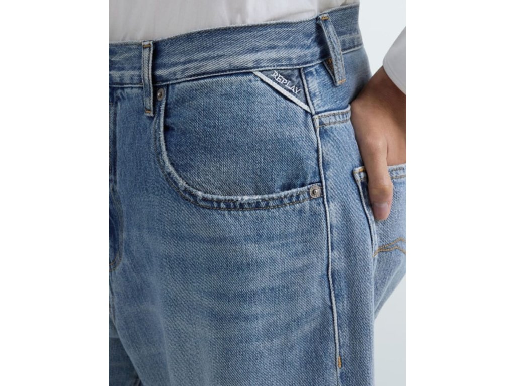 Detaily: 7/8 modré džíny s lehce zničeným pracím tónem a ošetřením pro vintage efekt, pískované odřeniny a oděrky na okrajích kapes a spodních lemech,  prezentačními 3D záhyby, pravidelný pas a rovná, široká nohavice, pět kapes, vzadu v pase designový , béžový label s bílým logem REPLAY, na pravé zadní kapse je vyšité červené R, nad levou přední kapsou je modrý label s bílým logem REPLAY, zapínání na zip a kovový knoflík s vyraženým logem REPLAY, velmi  příjemný materiál