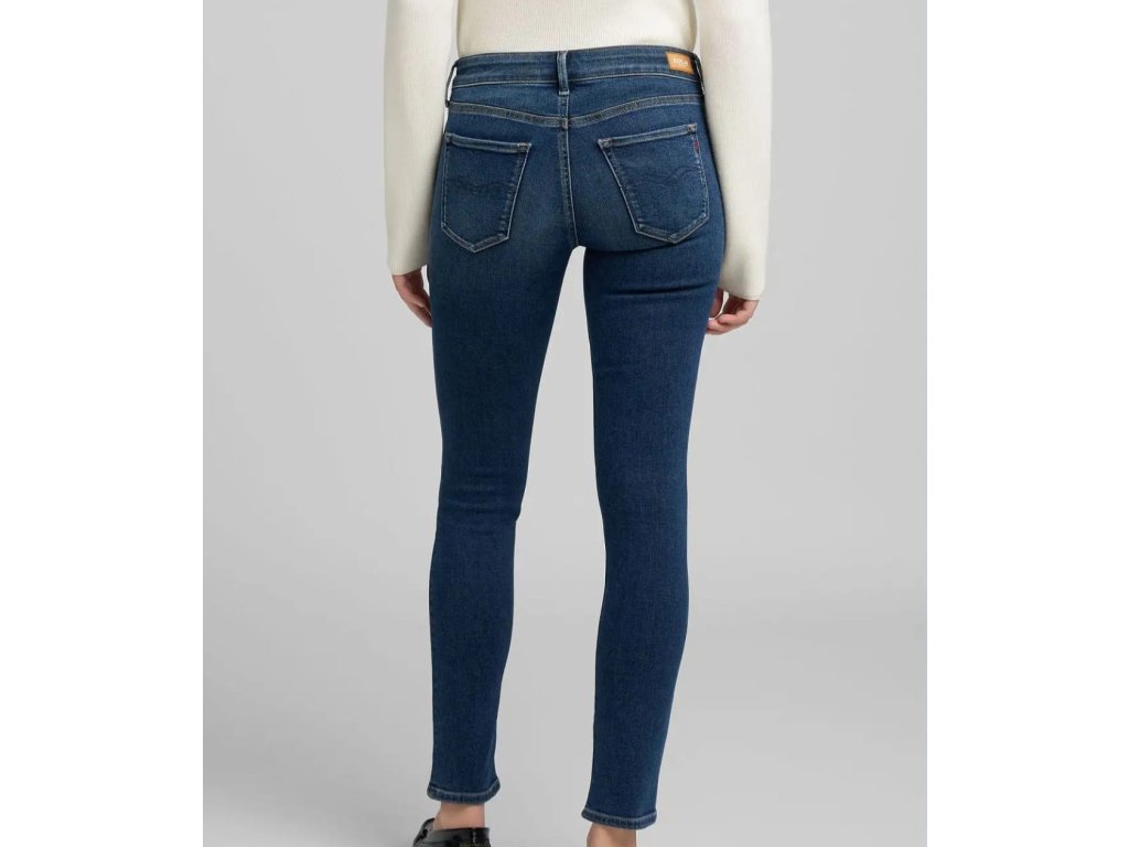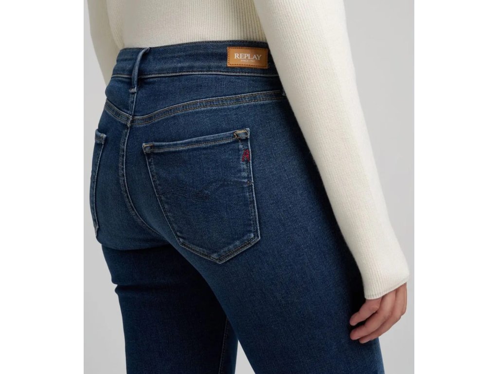 Detaily: modré džíny s lehce zničeným pracím tónem a ošetřením pro vintage efekt, pískované odřeniny, oděrky na okrajích kapes a spodních lemech, prezentačními 3D záhyby, pravidelný pas a zužující se štíhlá nohavice, pět kapes, zadní kapsy s ikonickým přešíváním racků, vzadu v pase je kožený label s vyraženým, bílým logem REPLAY, zapínání na zip a kovový knoflík s vyraženým logem REPLAY, velmi příjemný materiál