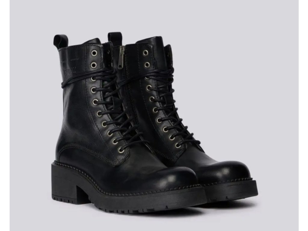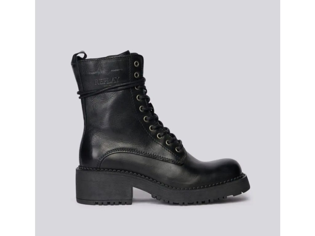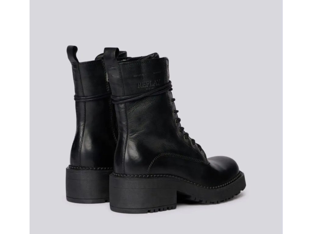 Detaily: černé, vysoké boty se šněrováním (22 cm), textilní černé tkaničky, černé, vyražené logo REPLAY na boku v horní části, podrážka je černá a vysoké 5 cm, boty jsou lehké a dobře sedí na noze, na boční straně je funkční zip na kterém je logo REPLAY
