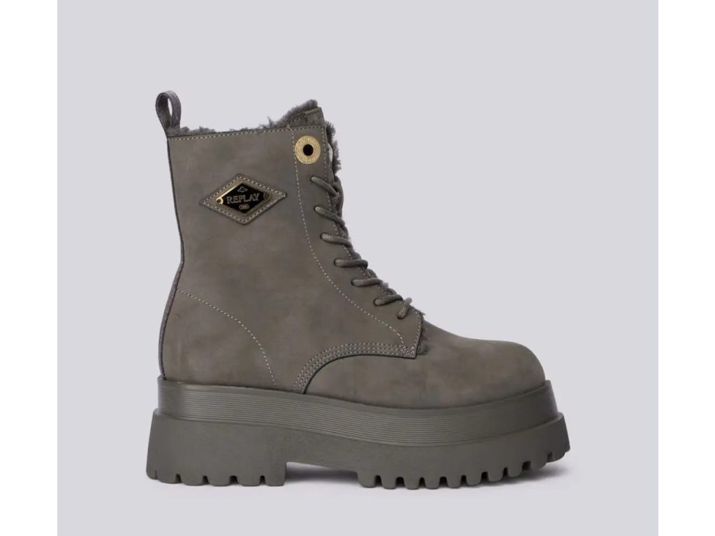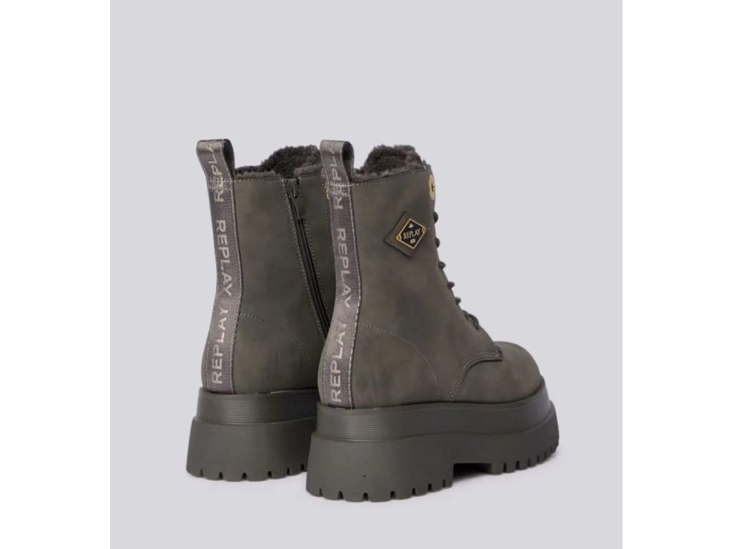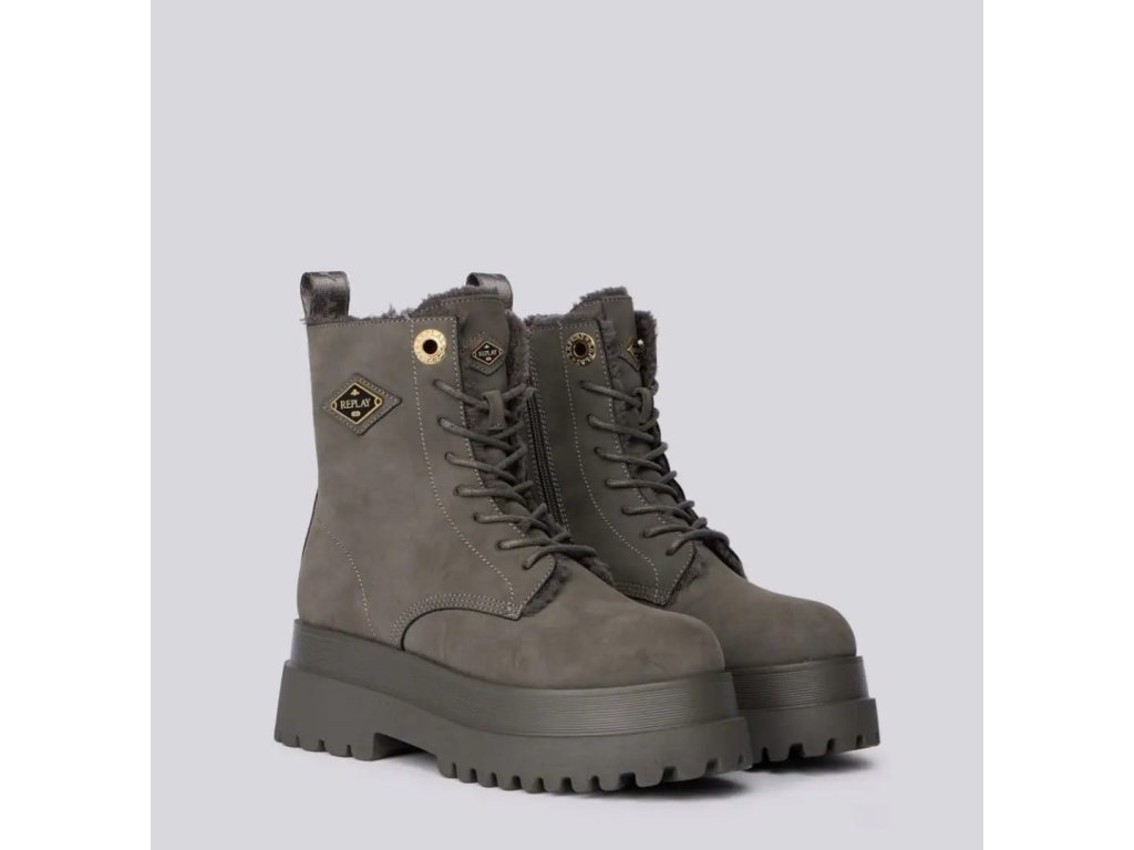 Detaily: šedé, vysoké boty se šněrováním (23 cm), textilní šedé tkaničky, látkovýpruh s logy REPLAY vzadu na patě, podrážky jsou šedé a vysoké 6 cm, boty jsou lehké a dobře sedí na noze, na jazyku boty je logo REPLAY na černém, designovém labelu, na boku je funkční zip s poutkem