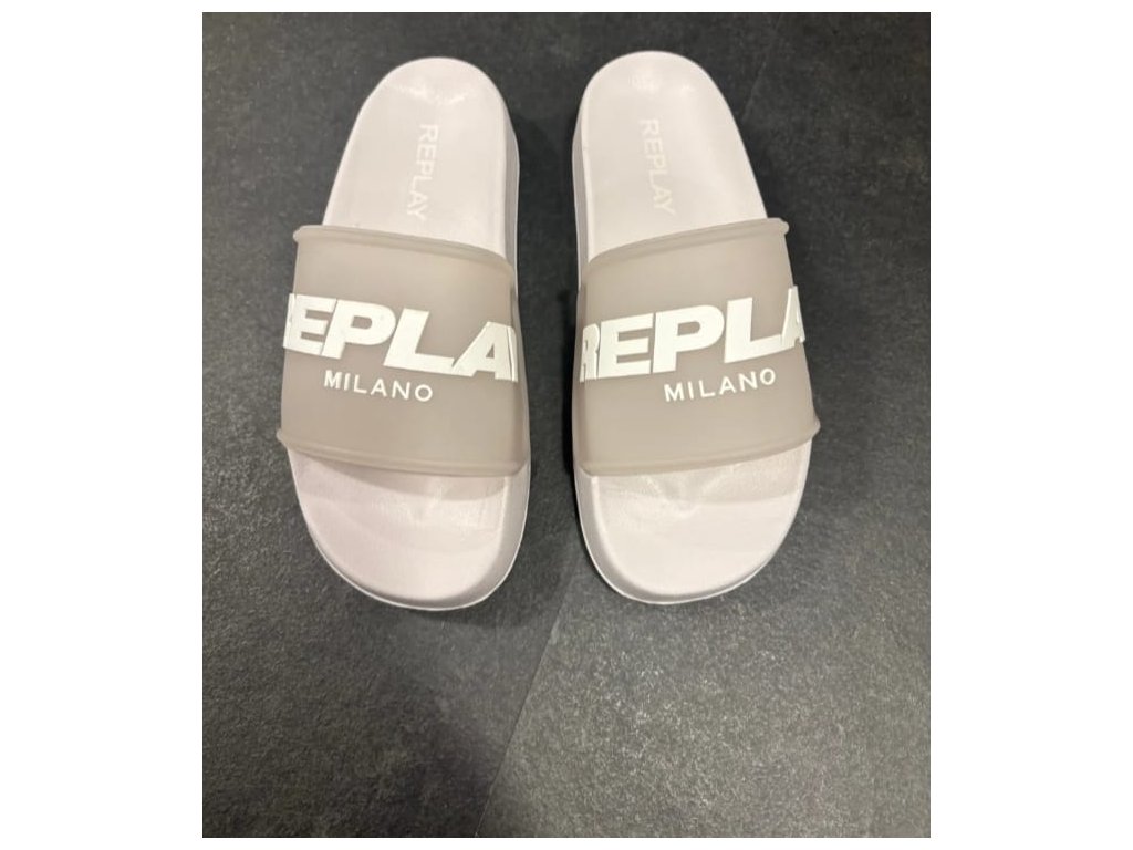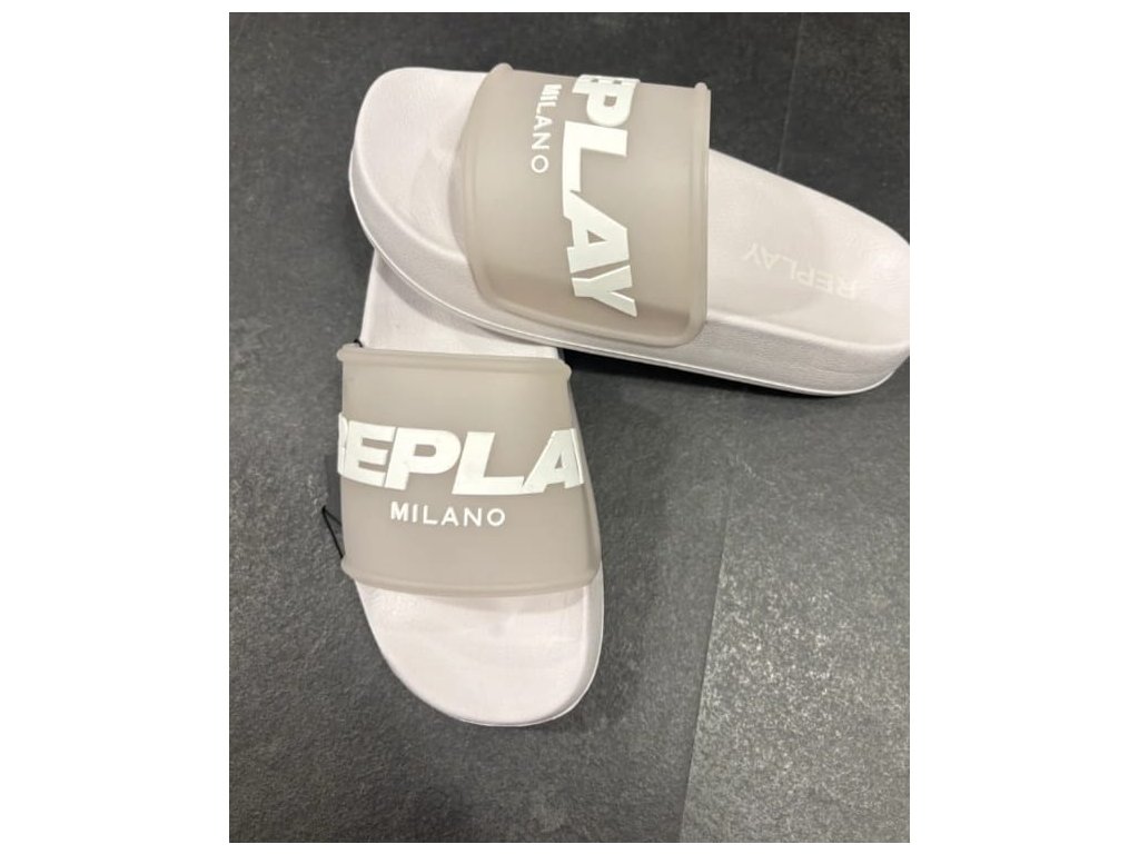 Detaily: pantofle REPLAY, vrchní pruh gumy je zdobený designovým bílým nápisem REPLAY MILANO, podrážka je bílá a vysoká 4 cm