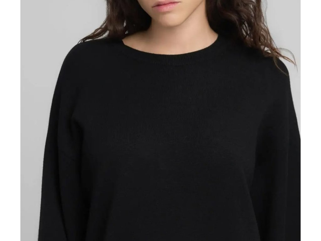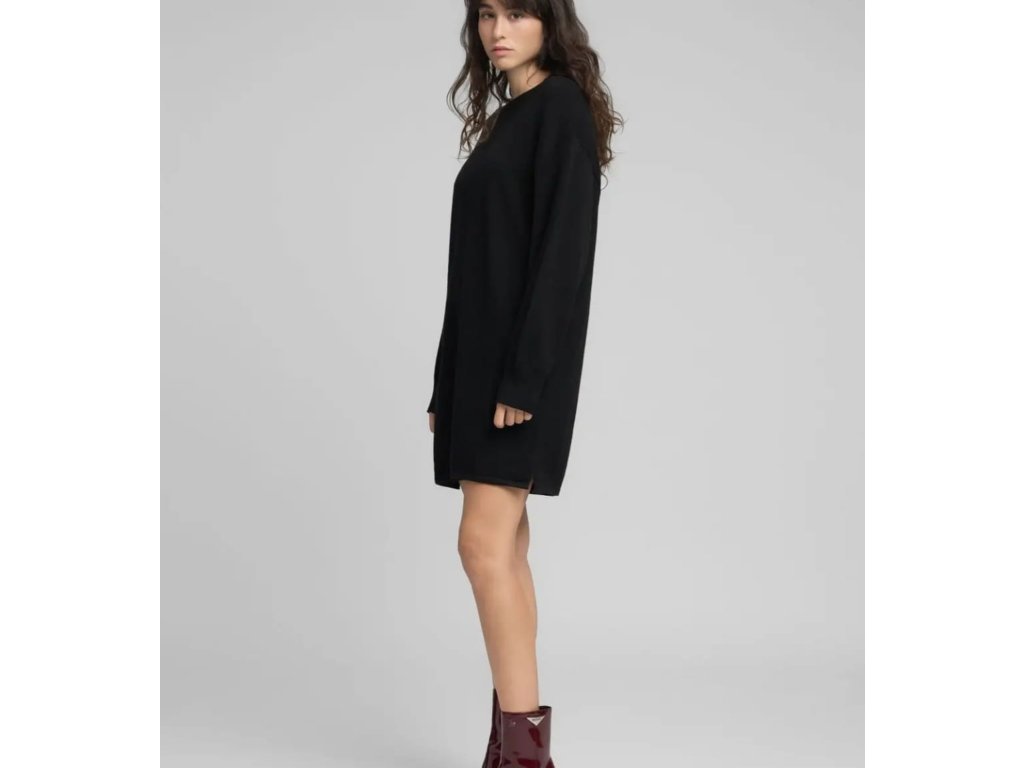 Detaily: dámské, černé mini šaty s dlouhým rukávem, který je do raglánu, za krkem je černé logo R, okraj rukávu a u krku je náplet,