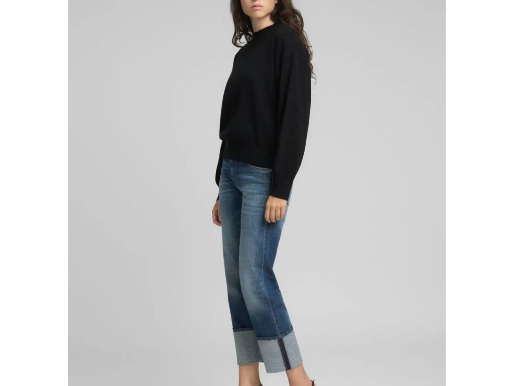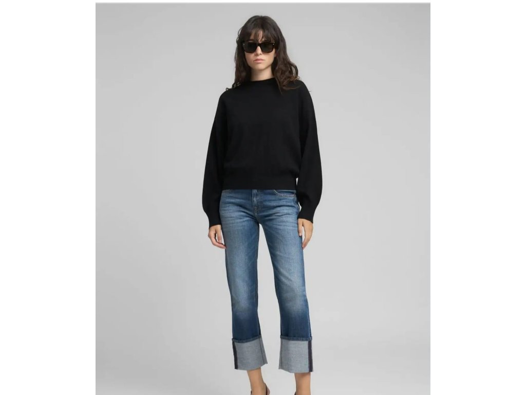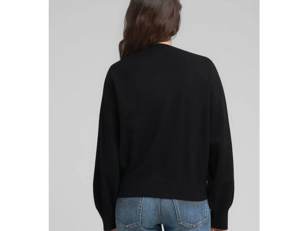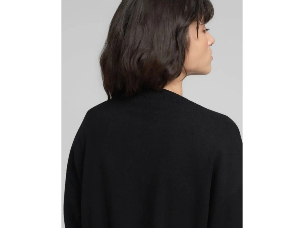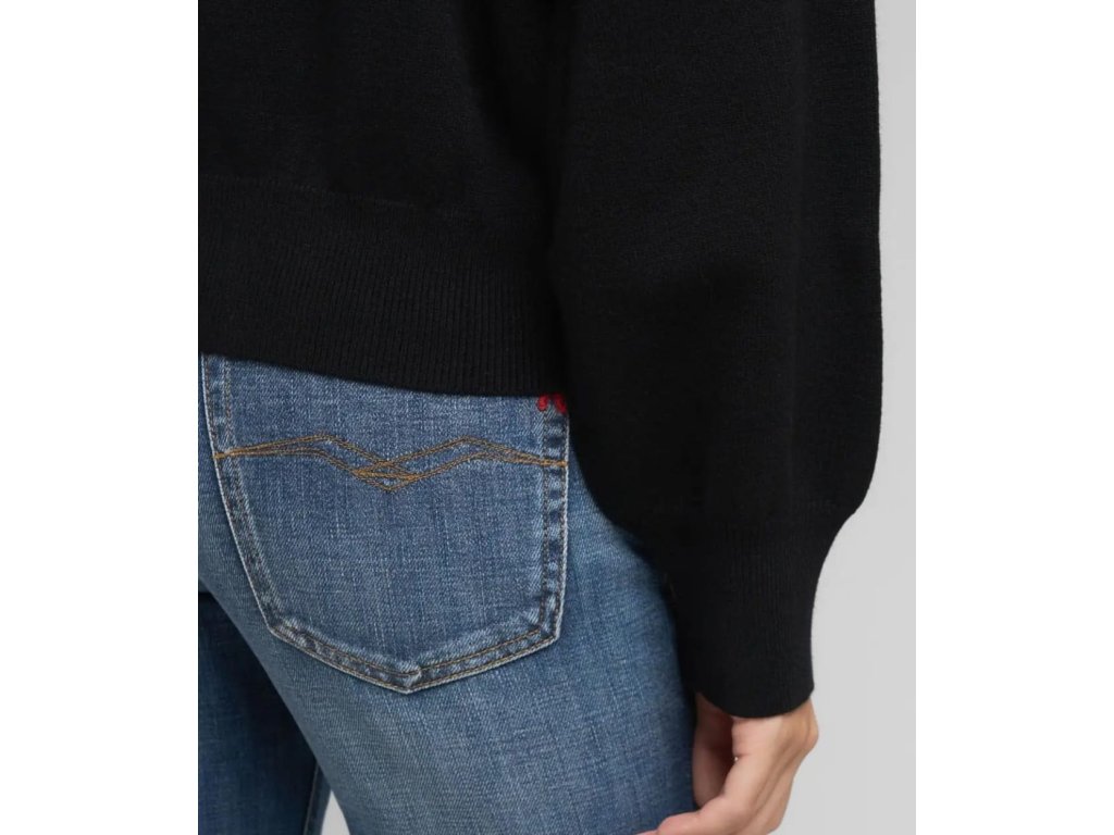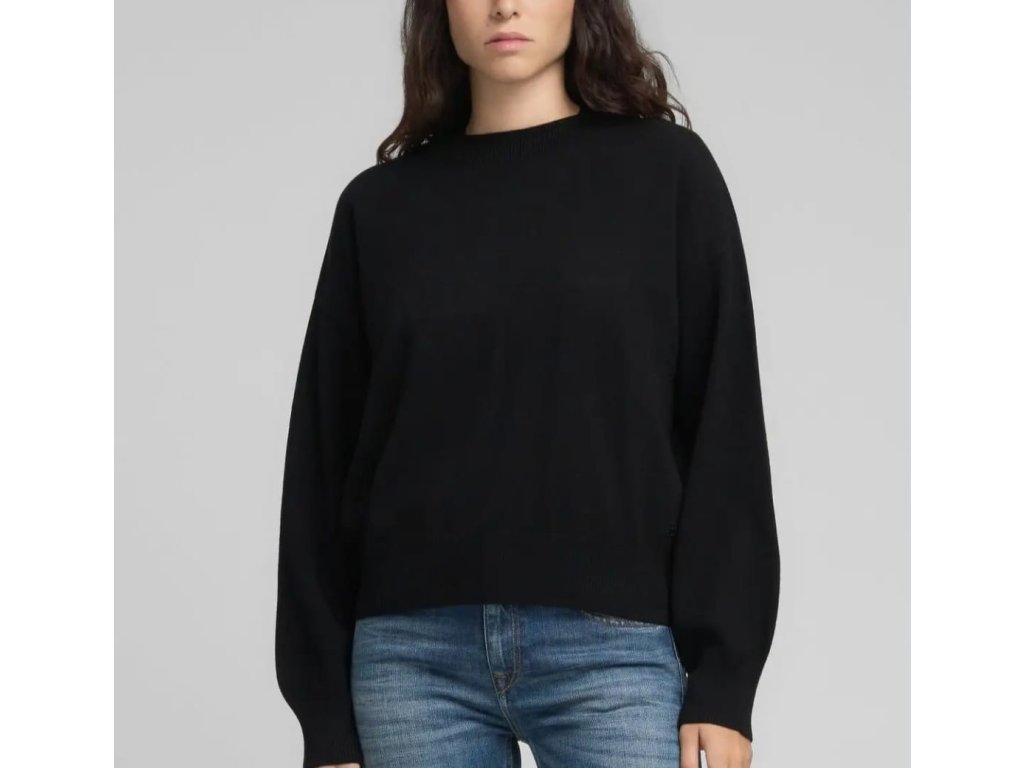 Detaily: dámský, černý svetr s dlouhým rukávem, který je do raglánu, na levém spodním okraji je černé logo R, svetr je kratší, velmi příjemný materiál