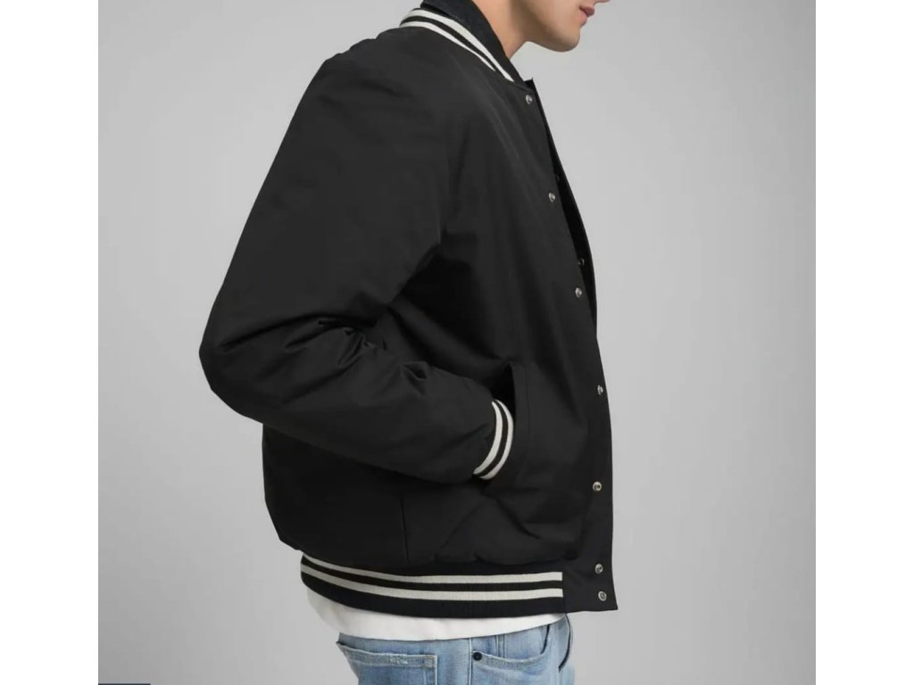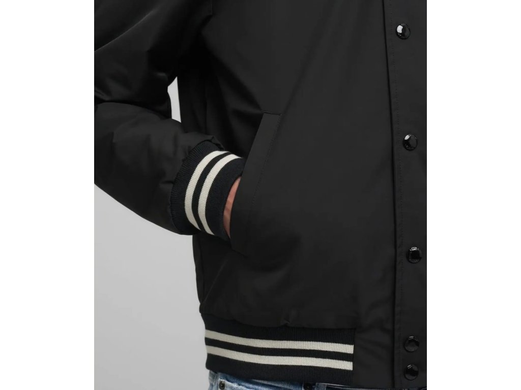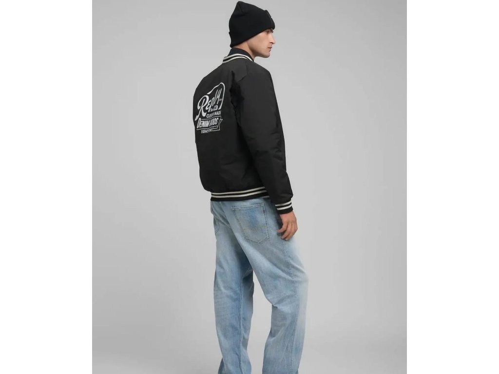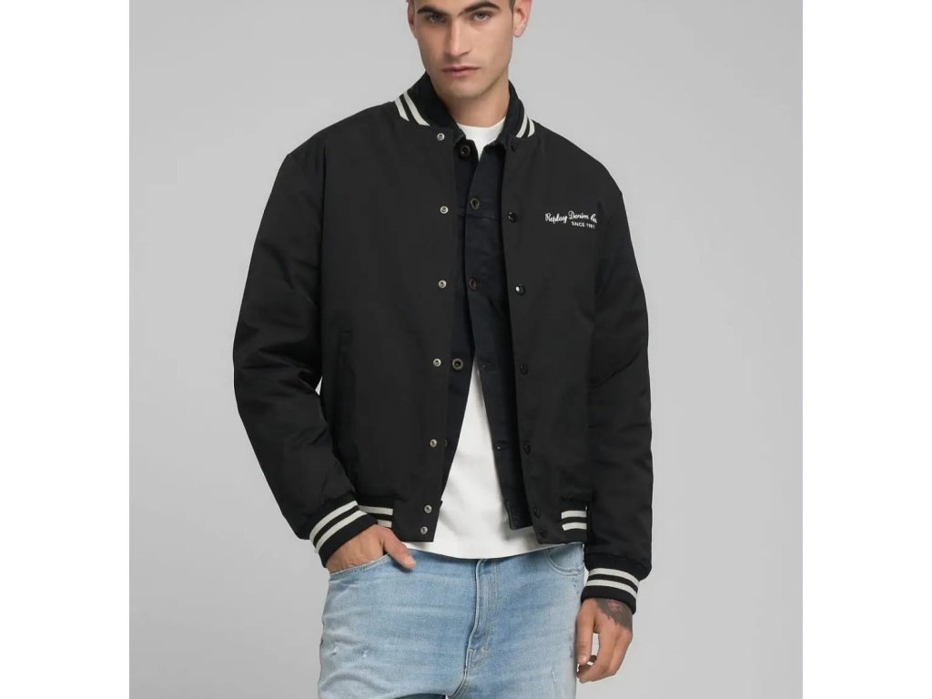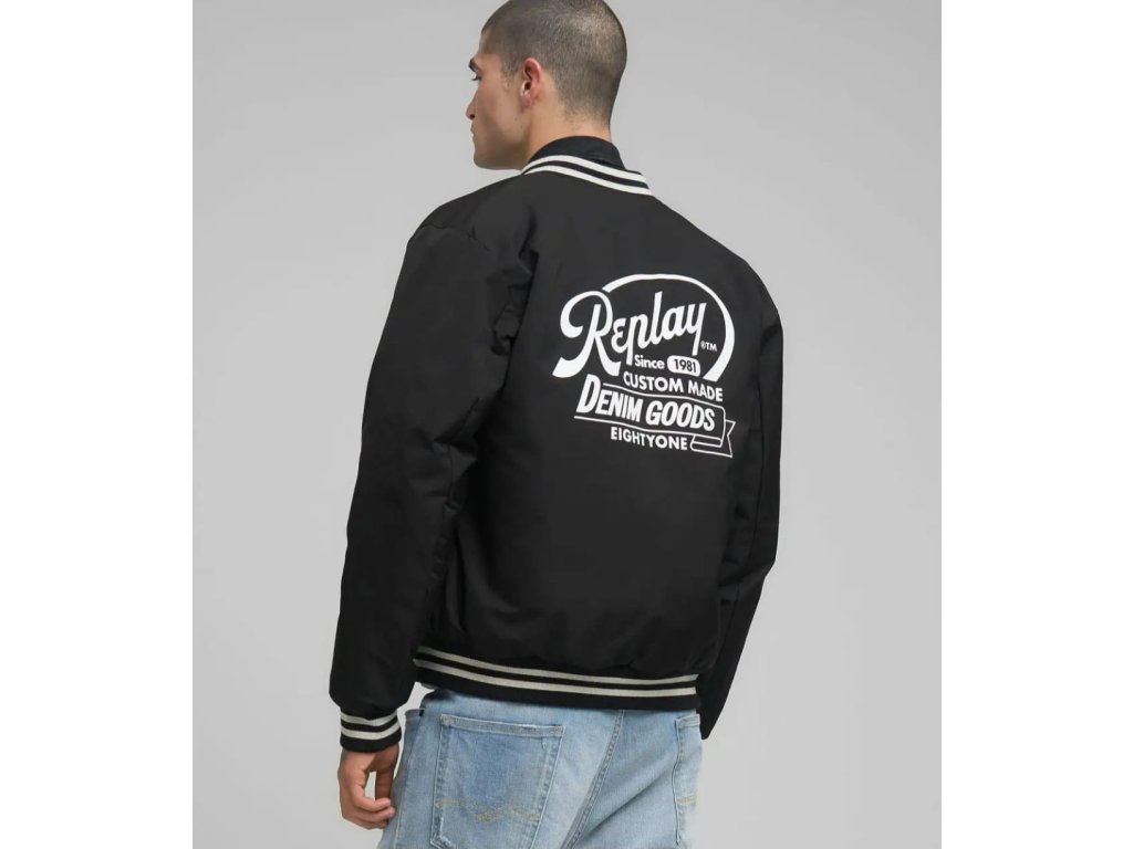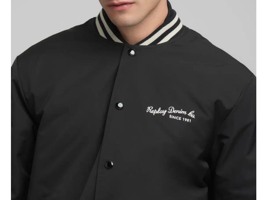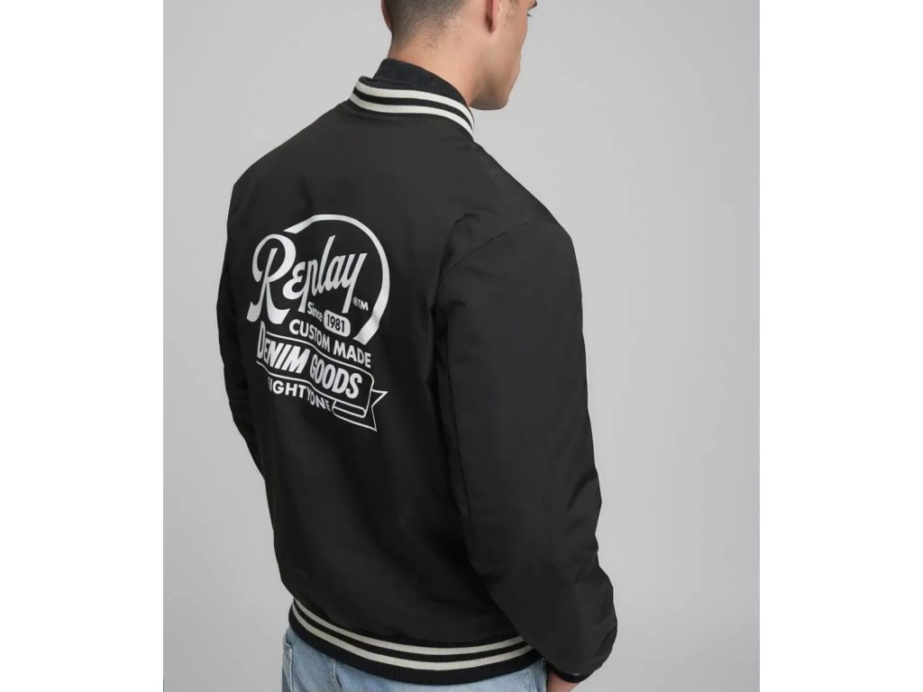 Detaily: černá pánská bunda, která má centrální zapínání na kovové, černé cvoky, na kterých je vyražené logo REPLAY, na levé straně hrudi je vyšité, bílé logo REPLAY, na konci rukávů a spodní okraj bundy je zakončený nápletem s bílými pruhy, na zádech je velké, designové, bílé logo REPLAY, velmi příjemný materiál