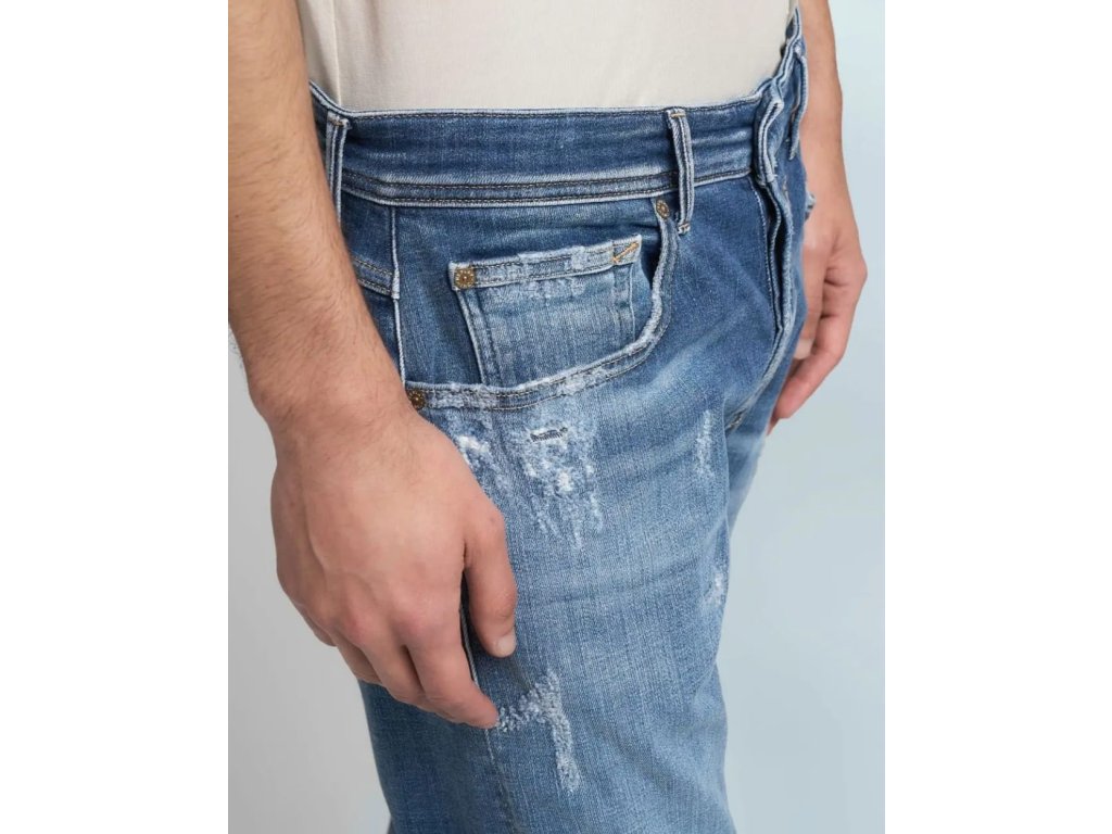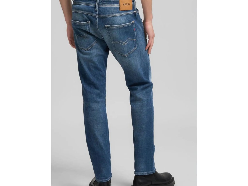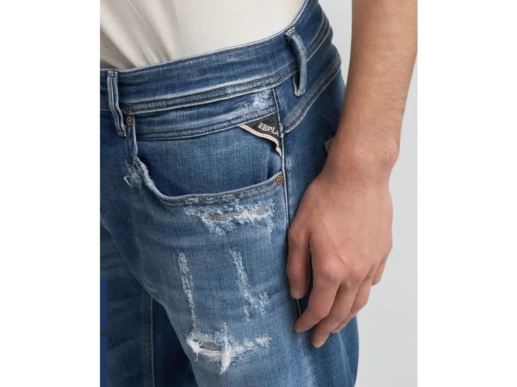 Detaily: modré džíny s lehce zničeným pracím tónem a ošetřením pro vintage efekt, pískované odřeniny, oděrky na okrajích kapes a spodních lemech a designové natrhání podšité látkou,  prezentačními 3D záhyby, pravidelný pas a jemně zužující se štíhlá nohavice, pět kapes, zadní kapsy s ikonickým přešíváním racků, na zadním poutku je kovový label s vyraženým logem REPLAY, na zadní straně pasu je kožený label s vyraženým logem REPLAY, zapínání na kovové knoflíky s vyraženým logem REPLAY, velmi příjemný a pružný materiál
