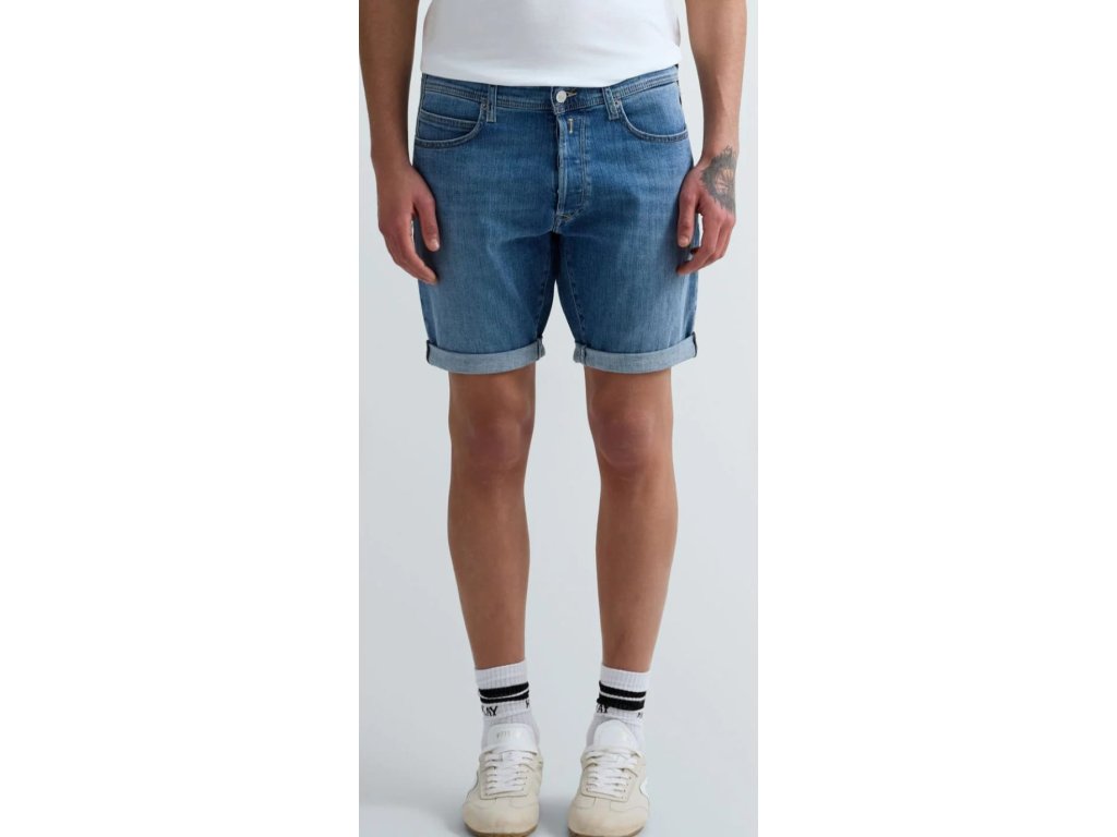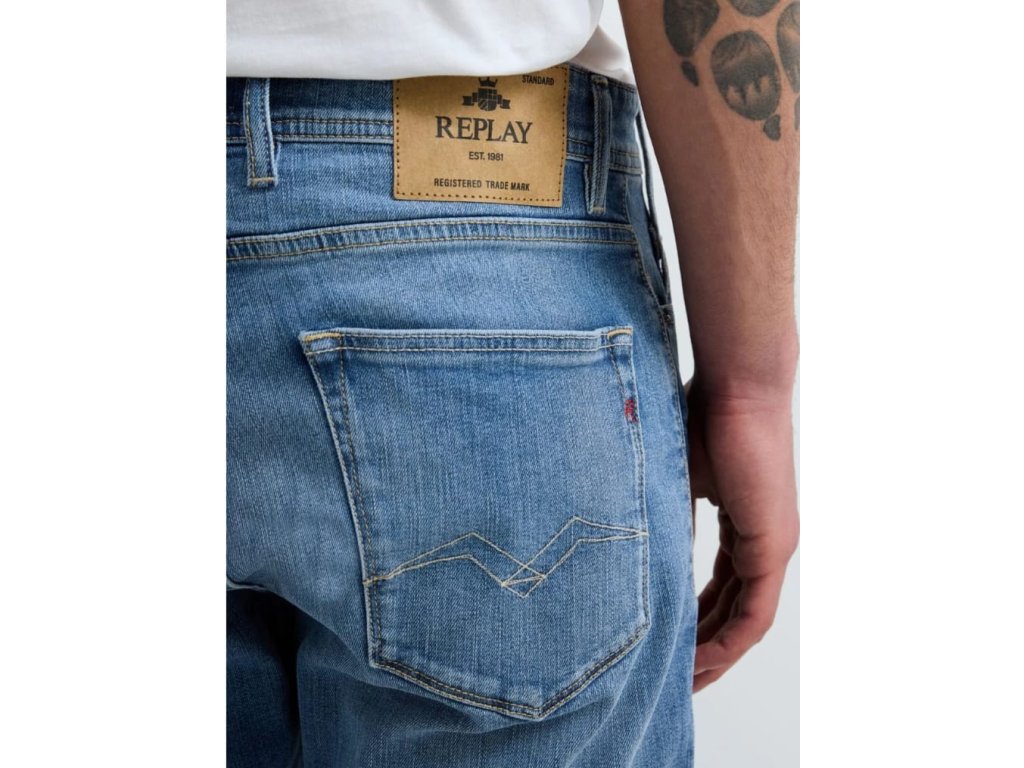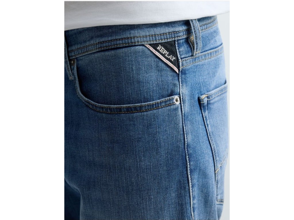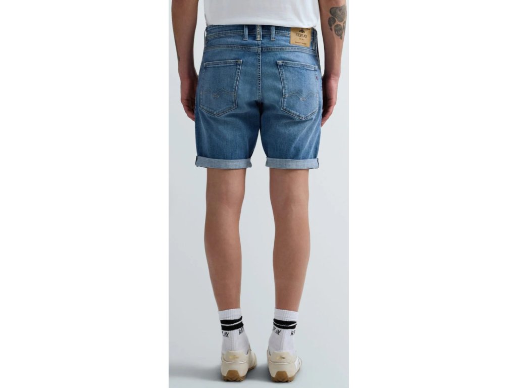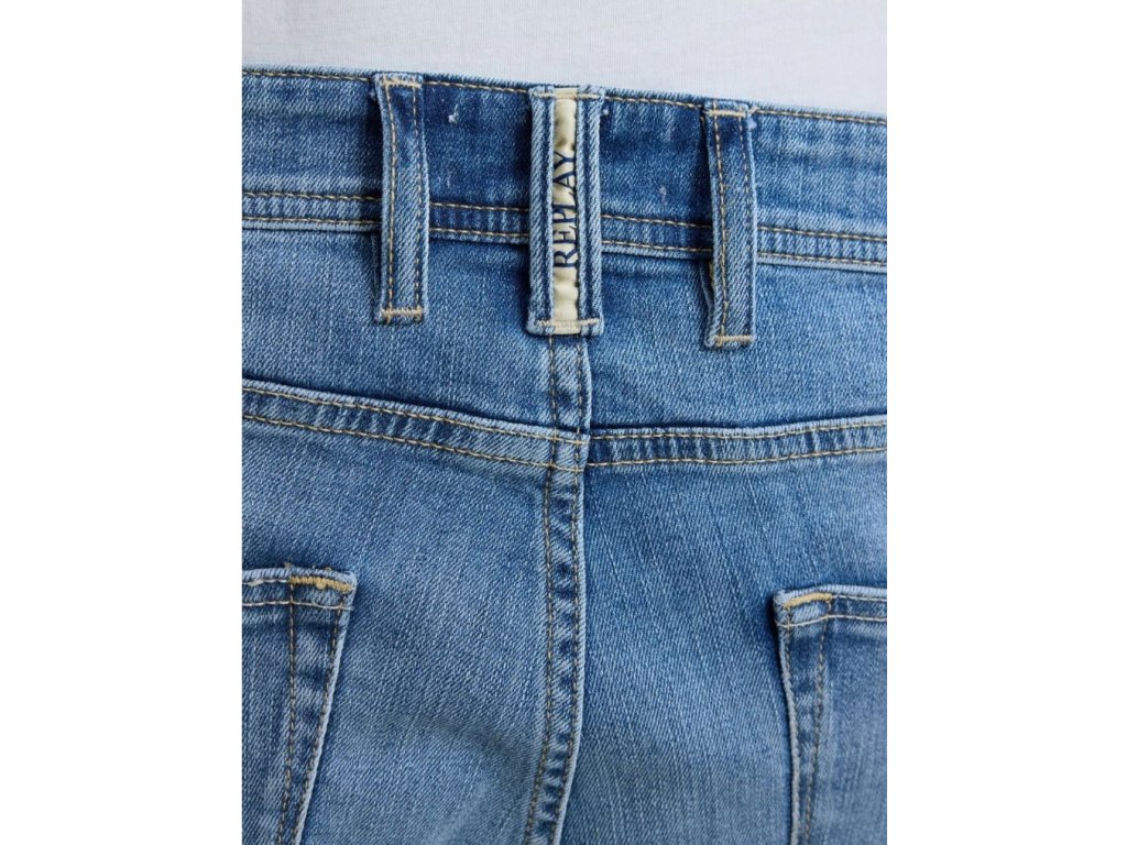 Detaily: kraťasy ze streč džínoviny se středně modrým praním a mechanickým ošetřením pro vintage vzhled, oděrky na okrajích kapes. Pravidelný pas a rovná nohavice, pět kapes, zadní kapsy s ikonickým přešíváním racků, vzadu na pravé straně je kožený, béžový label s hnědým logem REPLAY, zapínání na knoflíky s vyraženým logem REPLAY, nad levou přední kapsou je černý label s bílým logem REPLAY, na pravé zadní kapse je červené, vyšité logo R, velmi příjemný materiál
