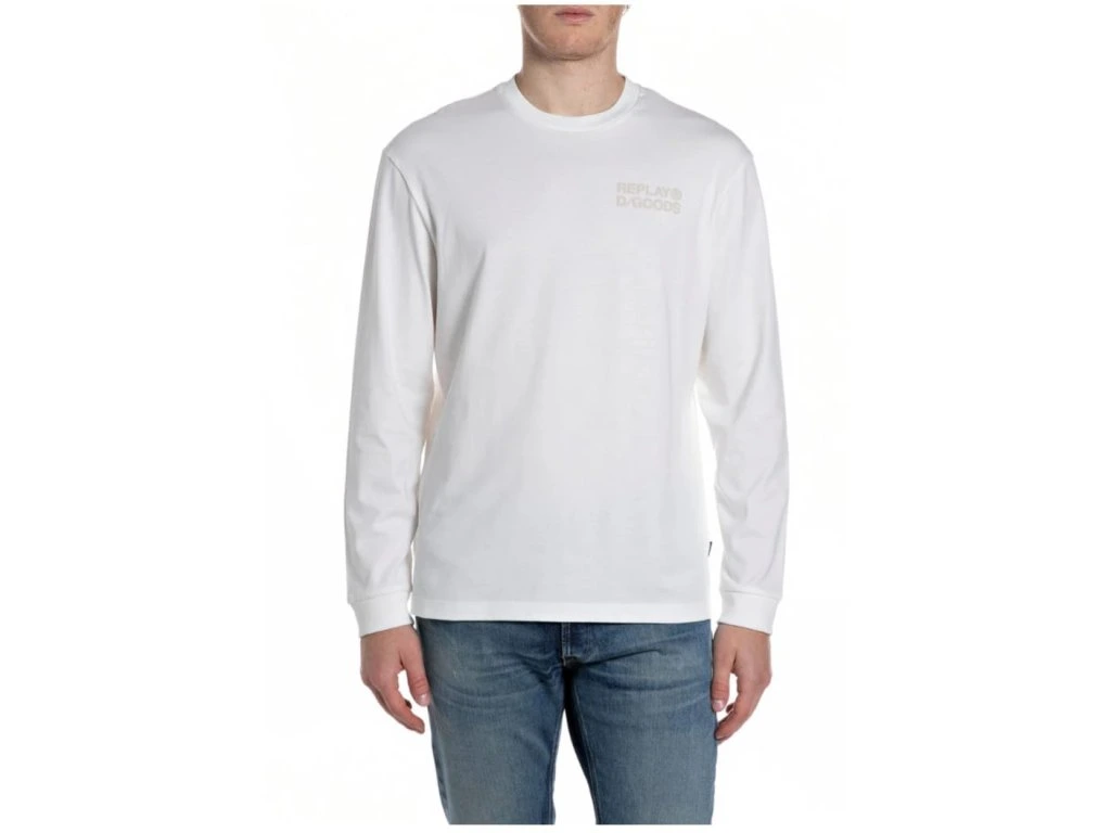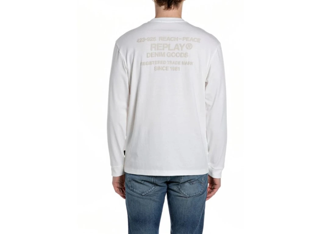 Detaily: pánské triko s dlouhým rukávem, na hrudi je béžové, silikonové logo REPLAY, na zádech je béžové, designové logo REPLAY, na levém boku je černý label s bílým logem REPLAY, velmi příjemný materiál