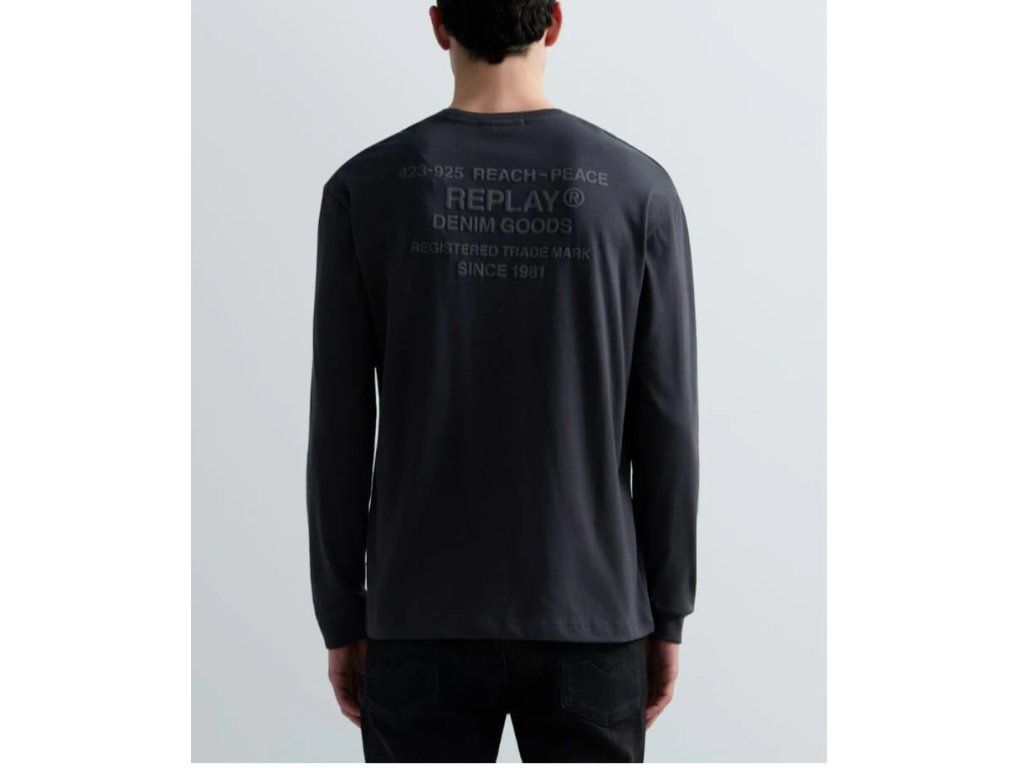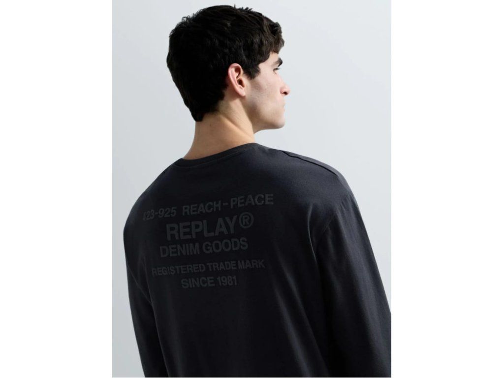 Detaily: pánské triko s dlouhým rukávem, na hrudi je šedé, silikonové logo REPLAY, na zádech je šedé, designové logo REPLAY, na levém boku je černý label s bílým logem REPLAY, velmi příjemný materiál