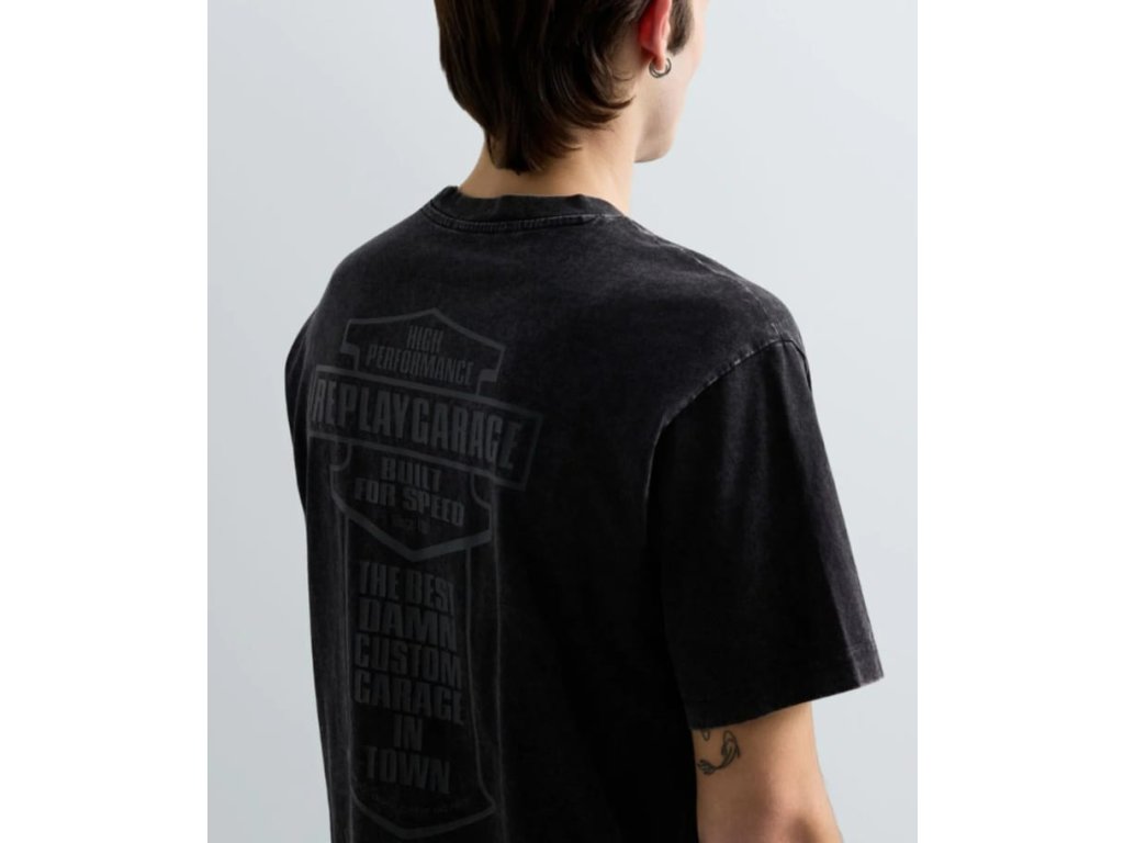 Detail: klasické, oprané triko, na hrudi je logo REPLAY a na zádech je designový obrázek s nápisem REPLAY GARAGE, velmi příjemný materiál