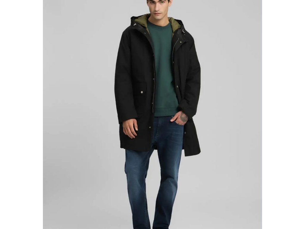 Detaily: pánský zimní kabát s dvojitou kapucí, která má regulaci a vnitřní část a podšívka je olivová, centrální zapínání na dvoucestný zip, na kterém je vyražené logo REPLAY, přes zip je klopa se zapínáním na niklové cvoky, dvě kapsy vpředu s klopou se zapínáním na niklové cvoky a postraní kapse, na levém rukávu je černé, silikonové logo REPLAY, uvnitř je velká kapsa se zapínáním na suchý zip